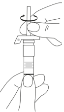 2. Hold sprøyten rett opp (kanylen opp). Kontroller at kanylen er ordentlig skrudd fast på sprøyten ved å skru beskyttelseshetten med klokken. Skru ikke til for hardt. Bank forsiktig på sprøyten med en finger slik at pulveret løsner fra sprøyteveggen.