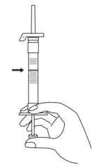 3. Hold sprøyten rett opp (kanylen opp). Trykk inn stemplet langsomt (6-8 sekunder) til den midterste gummiproppens øvre del når den blå linjen.