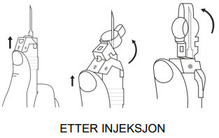 7. Trekk kanylen ut fra huden. På sikkerhetsbeskyttelsen finnes en pil. Trykk på klaffen på sikkerhetsbeskyttelsen i pilens retning rett etter injeksjonen. Da glir beskyttelsen mot kanylespissen og låses som beskyttelse for kanylen. Kontroller at det er låst ved å lytte og kjenne (når beskyttelsen låses kan du høre et «klikk» og det kjennes et «knepp»).
