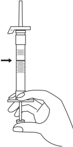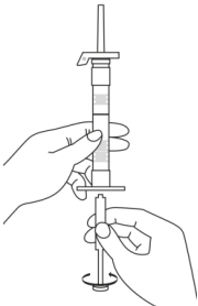1. For å klargjøre for injeksjon holdes sprøyten rett opp (kanylen opp). Skru fast stempelet på sprøytens bunn til den bakerste gummiproppen begynner å snurre.
