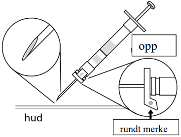 6. Rengjør hudområdet med aseptisk middel før injeksjon. Når injeksjonen gis, skal prikken på sikkerhetsbeskyttelsen peke oppover. Kontroller at kanylen ikke punkterer et blodkar og injiser alt innholdet i sprøyten under huden samtidig, som ved en normal injeksjon.