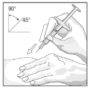 Når sprøyten er tom, fjernes kanylen fra huden i samme vinkel som ved innsetting.