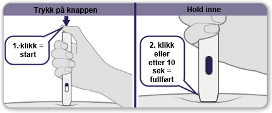 Merk: Hvis du ikke klarer å starte injeksjonen som beskrevet, skal du trykke pennen hardere mot huden og trykke på den grønne knappen på nytt.