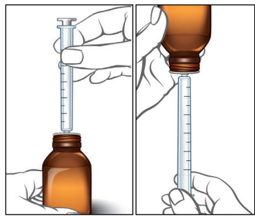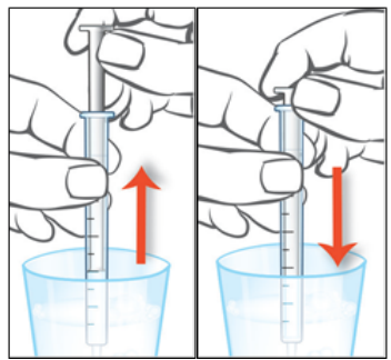 5. Trekk sprøytesylinderen langsomt tilbake, slik at det nødvendige volumet (antall ml) mikstur trekkes inn i sprøyten. Plasser stempelenden på linje med foreskrevet volummarkering, som vist på tegningen.
