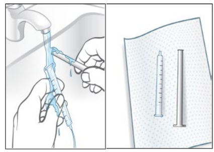 Rist vannet av stempelet og sprøyten, og la delene lufttørke til neste gang de skal brukes. Sørg for at oralsprøyten er helt tørr før den brukes neste gang. Dersom det kommer vann inn i flasken, kan miksturen bli uklar.