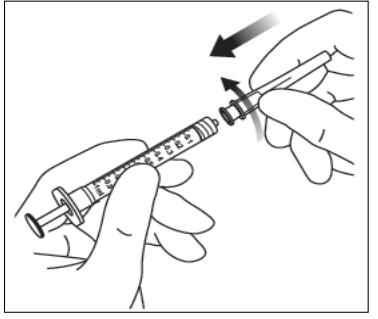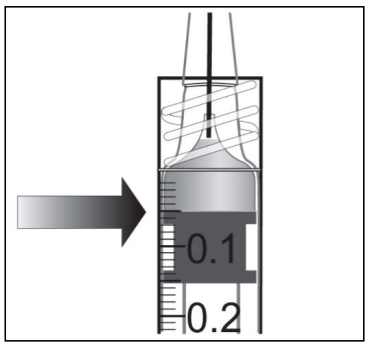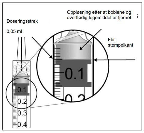 9. For å fjerne alle boblene og overflødig legemiddel, presses stempelet langsomt inn slik at den flate stempelkanten er på linje med streken som markerer 0,05 ml på sprøyten.