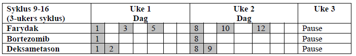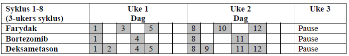 Tabell 1: Anbefalt tidsplan for å ta Farydak i kombinasjon med bortezomib og deksametason (syklus 1-8)