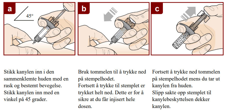 Dersom noe av det ovennevnte skjer, kast sprøyten i en punkteringssikker beholder beregnet for å kaste kanyler og bruk en ny ferdigfylt sprøyte.