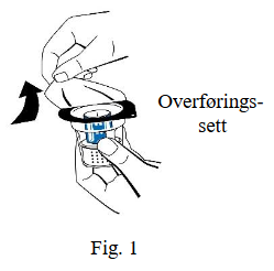 Overføringssettet må festes til hetteglasset med oppløsningsvæske først og deretter til flasken med lyofilisert pulver. Hvis ikke mistes vakuumet, og oppløsningsvæsken vil ikke bli overført.
