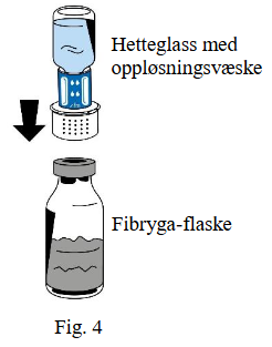 1. Sørg for at flasken med pulver (Fibryga) og hetteglasset med oppløsningsvæske har romtemperatur. Denne temperaturen bør opprettholdes under rekonstitueringen. Hvis vannbad brukes til oppvarming, pass på at vannet ikke kommer i kontakt med gummiproppene eller lokkene på beholderne. Temperaturen i vannbadet bør ikke overstige +37ºC.