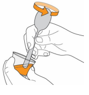 Vipp doseringskoppen lett og rør om forsiktig med håndtaket til en teskje av rustfritt stål inntil tablettene er fullstendig oppløst (dette kan ta 3 minutter eller mer). Oppløsningen vil være uklar og hvit når den er ferdig.
