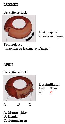 Inhalasjonspulver i Diskus. Hver Diskus inneholder 60 doser.