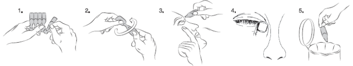 Dra forsiktig ned det nedre øyelokket slik at det dannes en lomme. Vri endosebeholderen opp-ned og klem på den slik at det kommer ut 1 dråpe i de(t) berørte øyet/øynene.