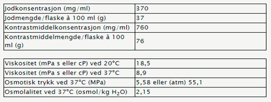 Virkestoffer: natriumamidotrizoat 0,1 g og megluminamidotrizoat 0,66 g (370 mg I/ml) Hjelpestoffer: dinatriumedetat, sakkarinnatrium, polysorbat 80, anisolje, renset vann.