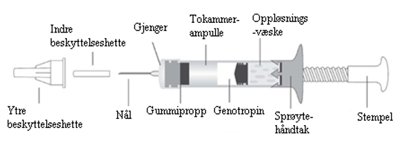 Tokammerampullen inneholder Genotropin i det ene kammeret og oppløsningsvæske i det andre. Når stempelet vris ”med klokken”, blandes Genotropin og oppløsningsvæsken automatisk.