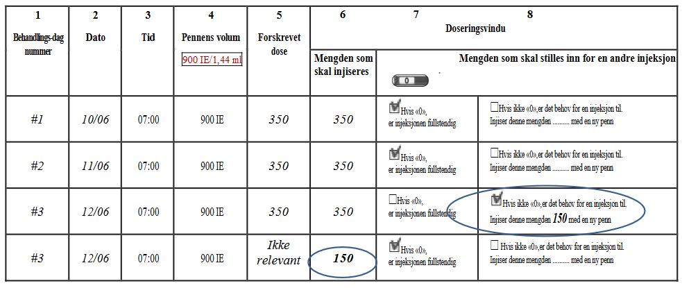 Ved behov, sett en ny injeksjon med en ny penn, hvor du stiller inn den gjenværende dosen notert under «Mengde som skal stilles inn for en andre injeksjon» (kolonne 8).
