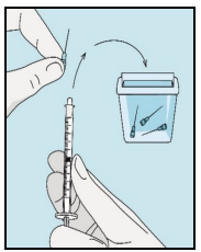 Ta den lange kanylen av sprøyten og kast den på korrekt måte slik at ingen kan skades.