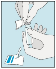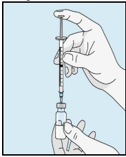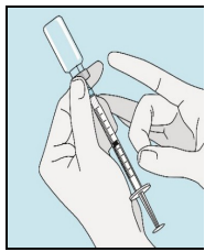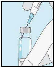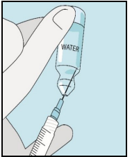 Åpne hetteglasset med det sterile vannet til injeksjonsvæsker. Stikk kanylen inn i hetteglasset og snu hetteglasset med vann forsiktig opp ned. Pass på at spissen på kanylen alltid befinner seg under vannoverflaten for å hindre at luftbobler kommer inn i sprøyten.