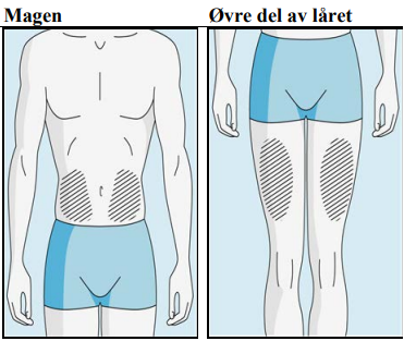 De beste stedene å injisere er magen og øvre del av lårene, som vist på bildene. For å redusere risikoen for reaksjoner på injeksjonsstedet kan du regelmessig endre sted for Hepcludex-injeksjon.