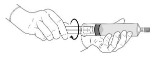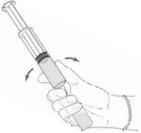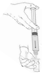 4. Uten å trekke kanylen opp fra hetteglasset holdes hetteglasset med pulver og sprøyten i et fast grep mens det ristes forsiktig for å sikre at pulveret blir fullstendig oppløst.