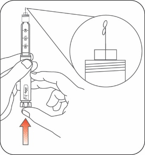 Fortsett å holde pennen med kanylen pekende oppover. Press doseringsstempelet inn inntil det stopper og ”0” vises i doseringsvinduet. Hold doseringsstempelet inne og tell sakte til 5.