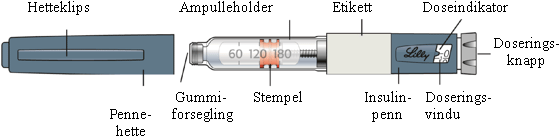 KwikPen («pennen») er en ferdigfylt engangspenn som inneholder 3 ml (300 enheter, 100 enheter/ml) insulin. Du kan sette flere doser med én penn. Pennen stilles med 1 enhet av gangen. Du kan injisere fra 1 til 60 enheter i én enkelt injeksjon. Dersom dosen din er høyere enn 60 enheter må du ta mer enn én injeksjon. Stempelet beveger seg bare litt ved hver injeksjon og det kan hende du ikke ser at det beveger seg. Stempelet når enden av ampullen kun når du har brukt alle 300 enhetene i pennen.