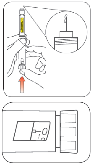 Fortsett å holde pennen med kanylen pekende oppover. Press doseringsstempelet inn inntil det stopper og ”0” vises i doseringsvinduet. Hold doseringsstempelet inne og tell sakte til 5.