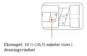 Antallet halve enheter (0,5 enheter) vises i doseringsvinduet på pennen din. Halve enheter (0,5 enheter) vises som linjer mellom tallene.
