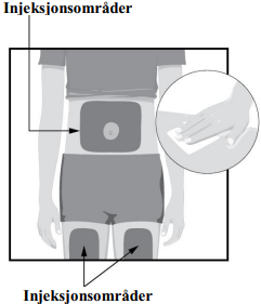 Pek den hvite pilen mot injeksjonsstedet (lår eller mage).