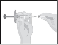 Dra forsiktig kanylehetten rett av med den andre hånden. Kast kanylehetten. Ikke sett kanylehetten tilbake på plass igjen.