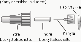 Skru kanylen av KwikPennen ved hjelp av den ytre beskyttelseshetten. Dette gjør at insulinet holder seg sterilt og forhindrer lekkasje. Det vil også forhindre at luftbobler kommer inn i KwikPennen og tetter den. Du må ikke dele kanyle eller penn med andre. Bytt beskyttelseshette på KwikPennen.