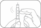 Fortsett å holde pennen med kanylen pekende oppover. Press doseringsstempelet inn inntil det stopper og ”0” vises i doseringsvinduet. Hold doseringsstempelet inne og tell sakte til 5.