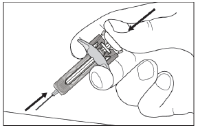 Hold stempelet helt inne mens du sakte og forsiktig trekker nålen rett ut fra injeksjonsstedet og slipper huden (se Figur J).