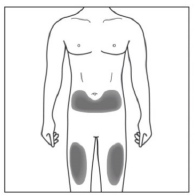 Anbefalt injeksjonssted er fremsiden av lårene. Du kan også bruke den nedre delen av magen, men ikke området som ligger innenfor 5 cm fra navlen (se Figur E).