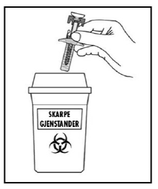 Kast brukte sprøyter i en spesialbeholder for spisse og skarpe gjenstander (lukkbar, punkteringssikker beholder). Av hensyn til sikkerheten og helsen til deg og andre, skal nåler og brukte sprøyter aldri brukes flere ganger.