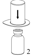 2. Plasser hetteglasset med væsken på en jevn og ren overflate og hold det godt fast. Ta tak i Mix2Vial sammen med pakningen og press spissen på den blå adapterenden rett ned i proppen på hetteglasset med væske.