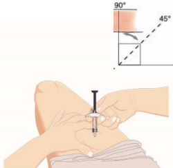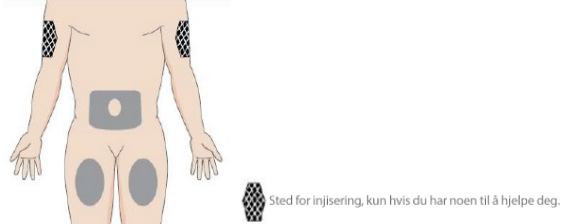 IKKE injiser nærmere enn 5 cm fra navlen eller på steder der huden er øm, har blåmerker, er rød, hard eller påvirket av psoriasis.
