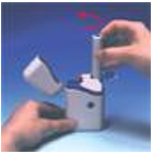 Sett injeksjonsvæsken ned i etuiet ved å trykke inn de blå knappene på siden.
