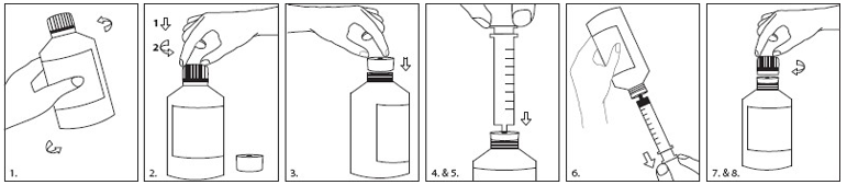 Hvis det finnes gjenværende mikstur i flasken mer enn 90 dager etter at den første gang ble åpnet, skal den ikke brukes.