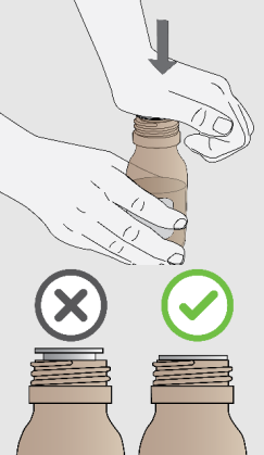 Viktig: Det kan kreve stor kraft å feste adapteren. Trykk hardt til den er trykt helt ned. Adapteren skal være helt i flukt med flasken, og du skal ikke kunne se noen kant.