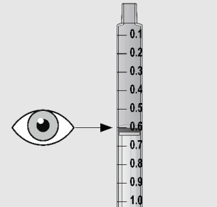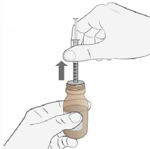 7. Snu flasken forsiktig opp-ned og trekk ned stempelet til toppen av den svarte proppen er på linje med den foreskrevne dosen på sprøytehylsen.
