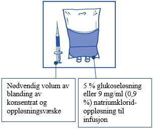 Injiser inn i en steril infusjonspose uten PVC med enten 5 % glukoseoppløsning eller 9 mg/ml (0,9 %) natriumkloridoppløsning til infusjon.