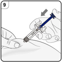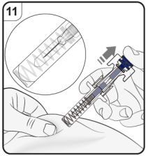 Trinn 11. Slipp stempelet Hold den ferdigfylte sprøyten på injeksjonsstedet og slipp stempelet langsomt til nålen er dekket av nålebeskyttelsen. Fjern den ferdigfylte sprøyten fra injeksjonsstedet og slipp grepet rundt huden. Det kan være litt blod på injeksjonsstedet. Du kan trykke en bomullsdott eller gaskompress over injeksjonsstedet til blødningen stopper. Ikke gni på injeksjonsstedet. Dekk om nødvendig injeksjonsstedet med et lite plaster. |