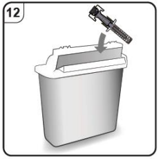 Trinn 12. Kast den ferdigfylte sprøyten Legg den ferdigfylte sprøyten i en beholder for skarpe gjenstander umiddelbart etter bruk. Ikke kast den ferdigfylte sprøyten som husholdningsavfall. Snakk med lege eller apotek om riktig avhending av beholderen for skarpe gjenstander. Det kan være lokale bestemmelser om avhending. |