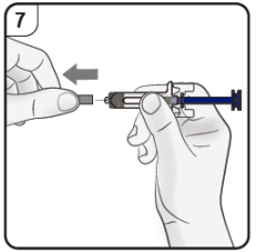 Trinn 7. Fjern nålehetten Trekk hardt og rett for å fjerne nålehetten fra den ferdigfylte sprøyten. Du vil kanskje se en dråpe væske på enden av nålen. Dette er normalt. Ikke sett nålehetten på igjen. Kast nålehetten. |