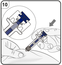 Trinn 9. Start injeksjonen Fortsett å klemme rundt huden. Trykk langsomt på stempelet så langt det går. Dette sikrer at en full dose blir injisert. |