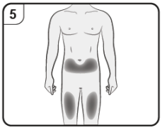 Trinn 5. Velg injeksjonssted Du skal injisere på forsiden av lårene eller nedre del av magen, men ikke området 5 cm rundt navlen. Ikke injiser inn i hud som er øm, har blåmerker, er rød, flasser, er hard, eller i områder med arr eller strekkmerker. Hvis omsorgspersonen, legen eller sykepleieren gir deg injeksjonen, kan de også injisere i overarmen. |