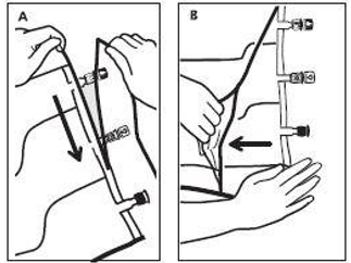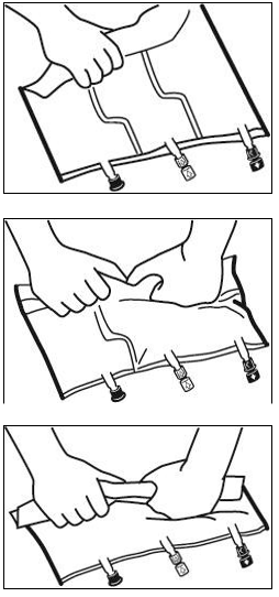 Rull posen stramt sammen fra siden med håndtak mot portene, først med høyre hånd og så ved bruk av et vedvarende trykk med venstre hånd, inntil de vertikale forseglingene brytes. De vertikale forseglingene brytes ved hjelp av væsketrykket. Forseglingene kan også åpnes før ytterposen er fjernet.