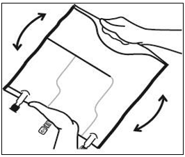 For å fjerne ytterposen, hold posen horisontalt og åpne ved å ta tak i et hjørne og dra langs bruddanvisningen i posens øvre kant (Bilde A).