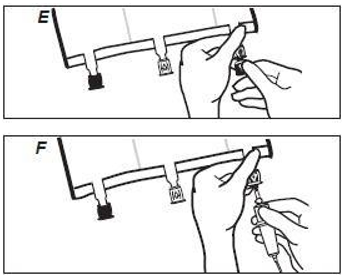 Kort tid før tilkobling av infusjonssettet brytes forseglingen på den blå infusjonsporten (Bilde E).